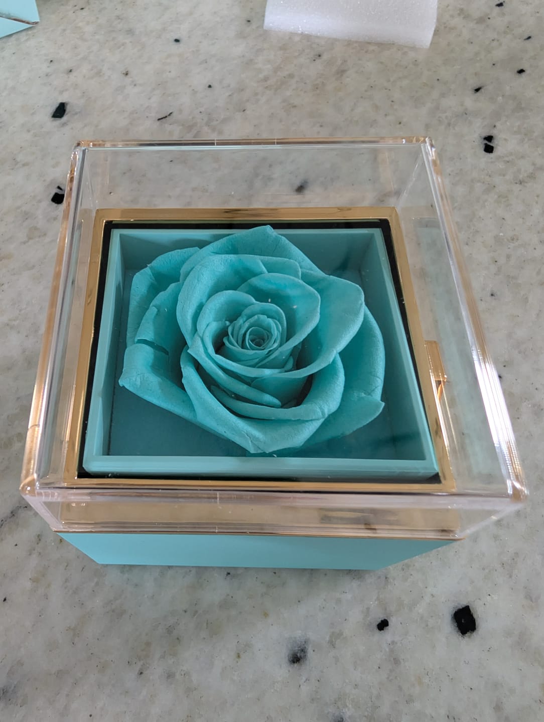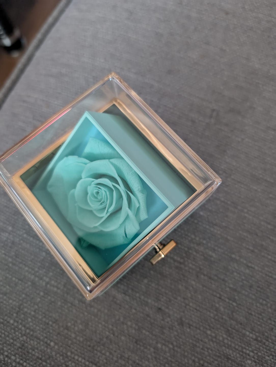The box turns over, the rose disappears, and the jewellery appears.